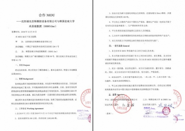대덕바이오는 중국측에게 한국에서 연구개발한 소나무 재선충병 방제제의 기술 지도와 상품 생산을 제공한다는 구체적인 협약 내용을 담았다.